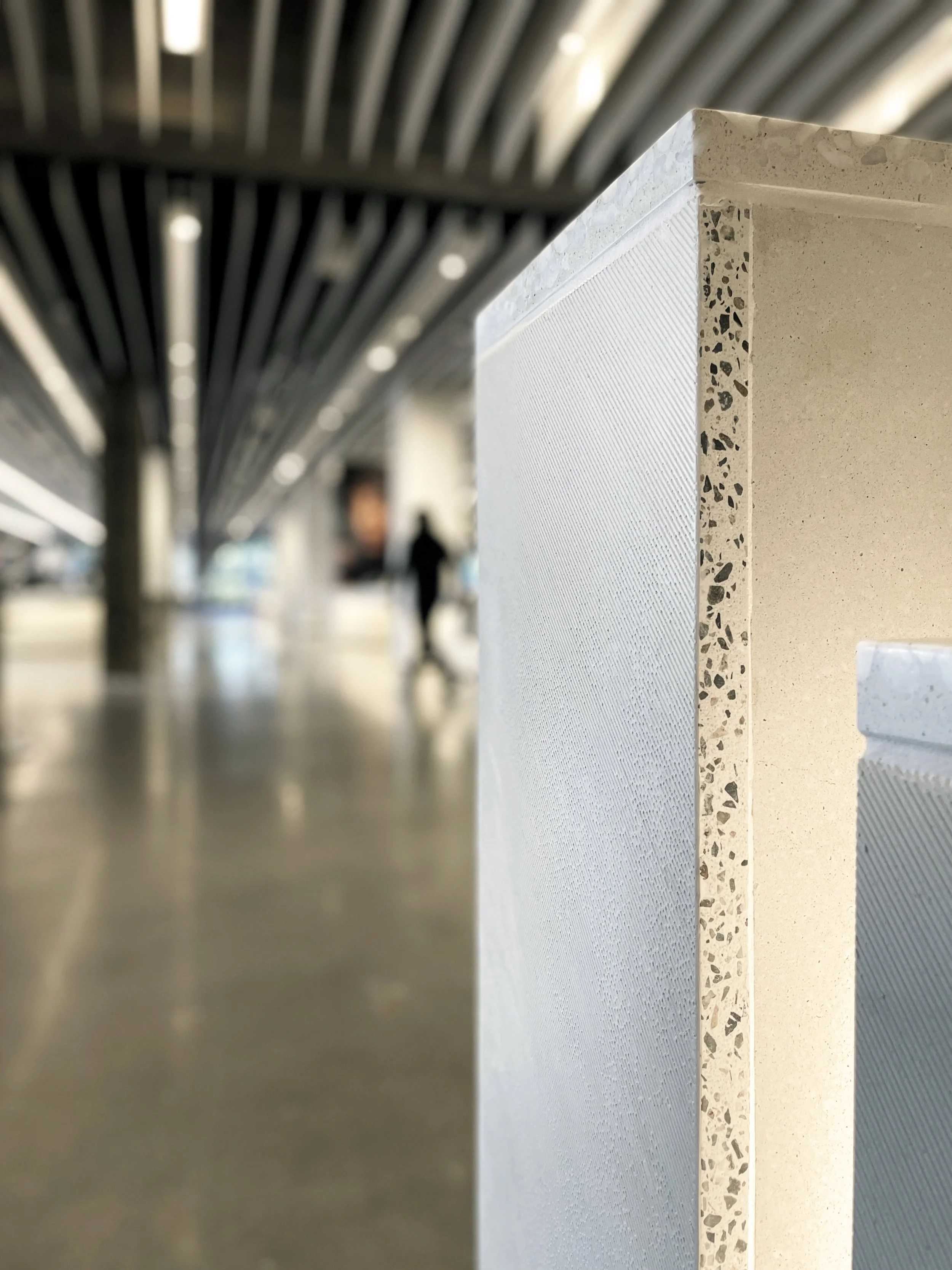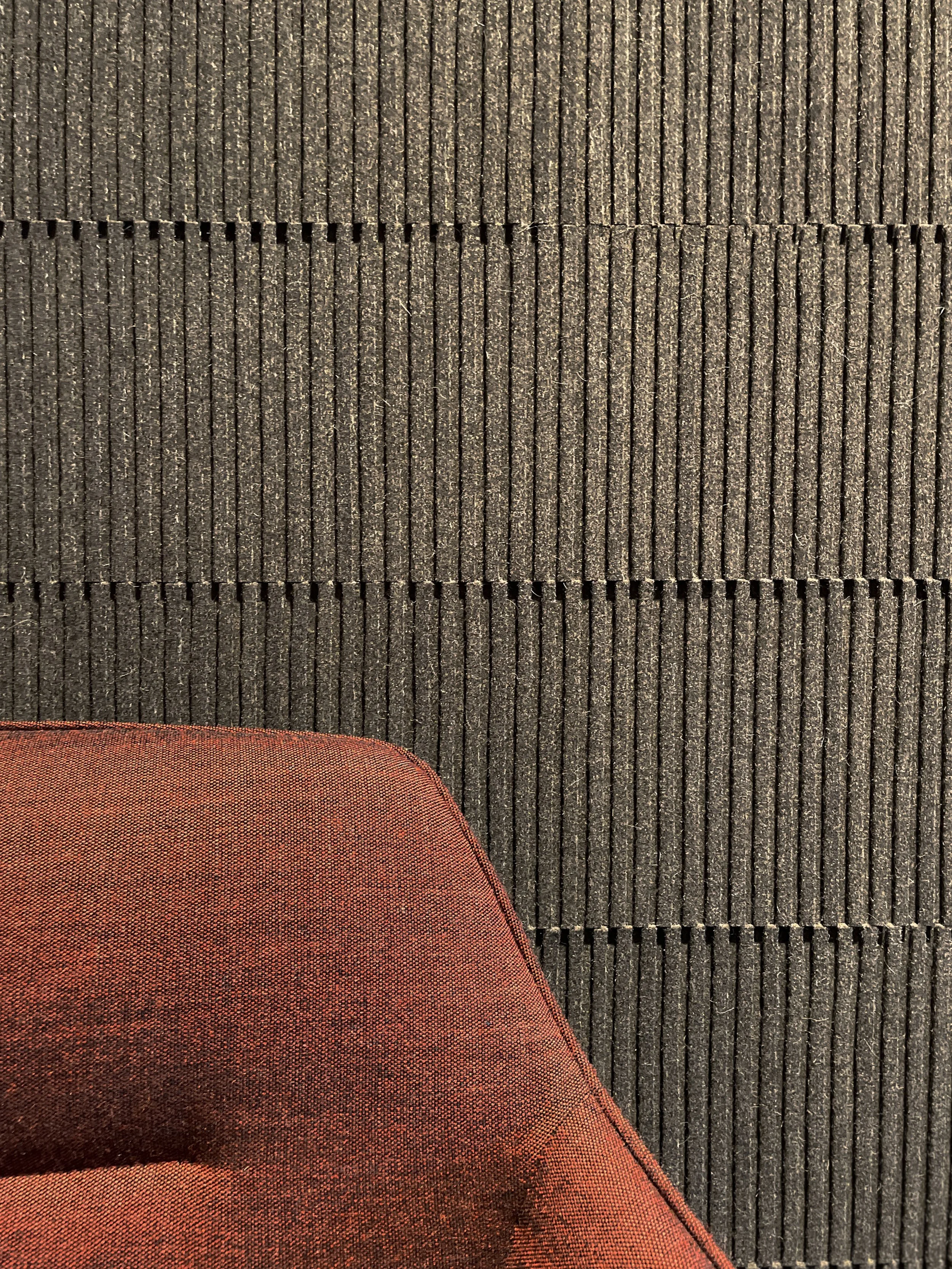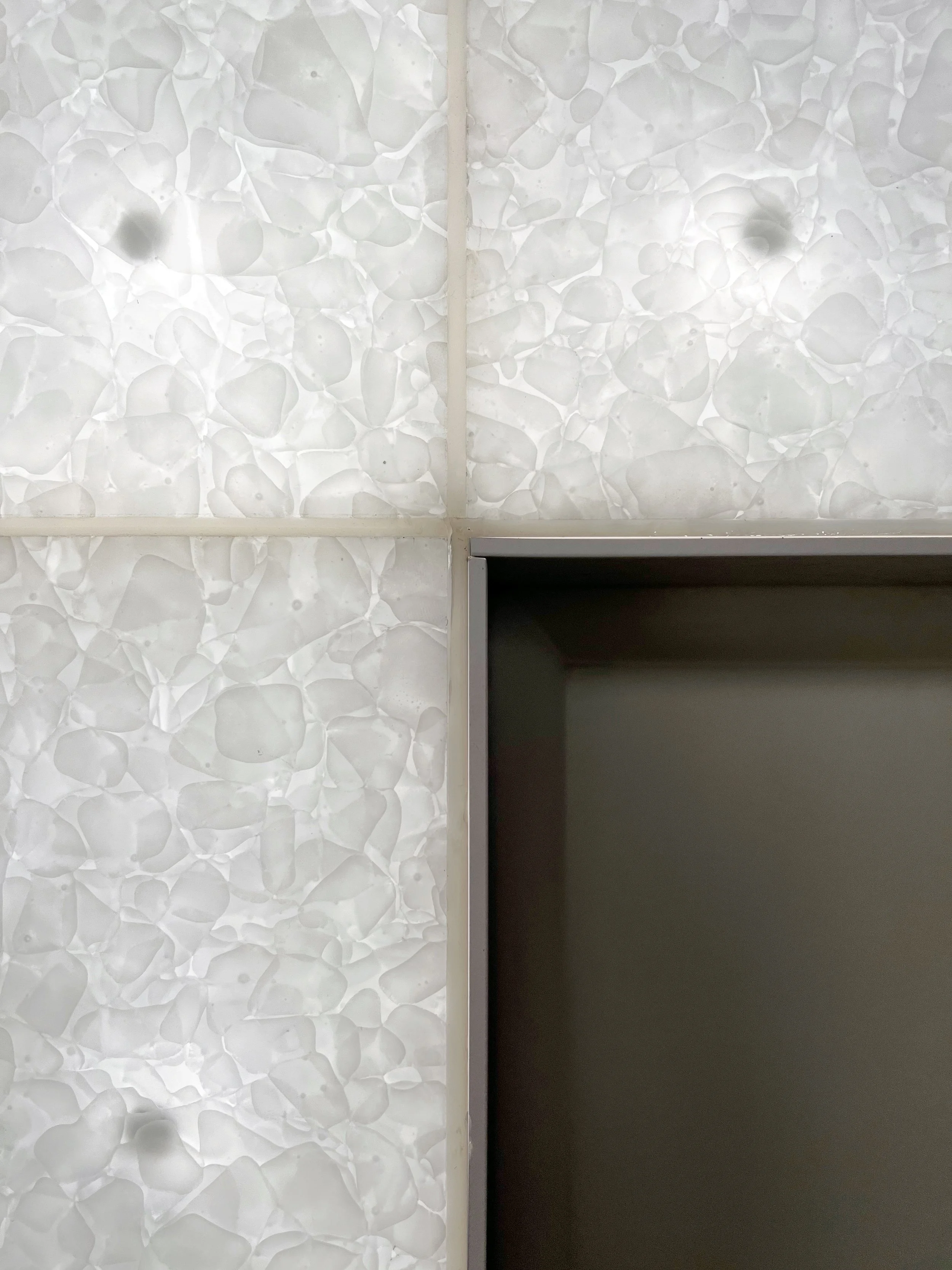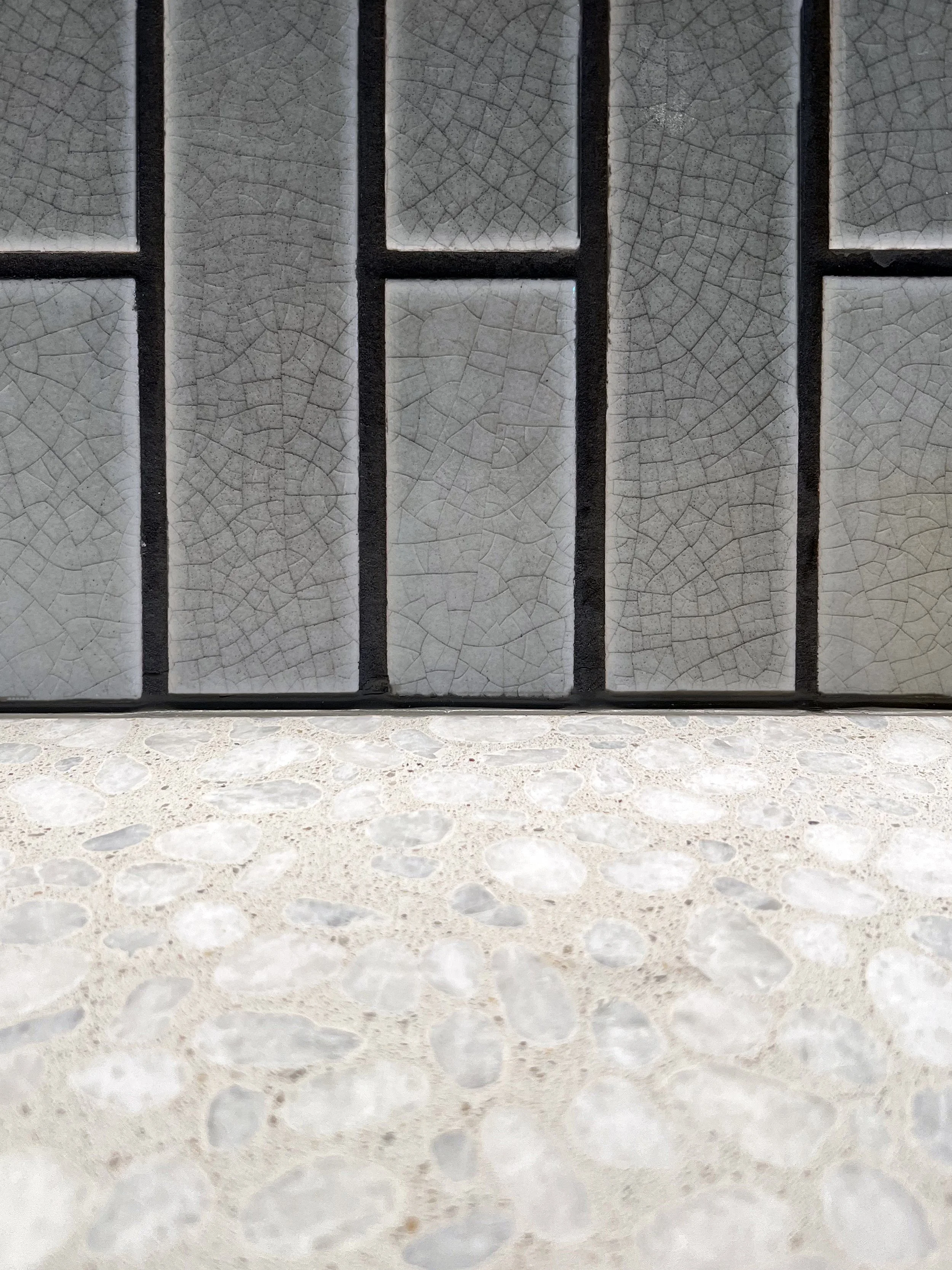 Throughout the three program zones we crafted a cohesive palette of subtle but rich and highly tactile materials. The exhibits are eye-catching and dynamic, and so the architectural materials provide a calm backdrop that draws you in for a second glance and a gentle touch. They are both timeless in their simplicity but also an embodiment of a sustainable future. They include back-lit panels made of fused recycled glass, acoustic ceiling baffles made from recycled PET bottles, felt walls made from un-dyed sheep’s wool, wall panels and hidden doors clad in super-matte metallic nanocomposites, door and cabinet surrounds made from recycled paper panels with sustainably harvested bamboo cores, and hand-made concrete tiles and terrazzo countertops in a subtle variety of textures. We are proud to say that the project achieved LEED Platinum certification.