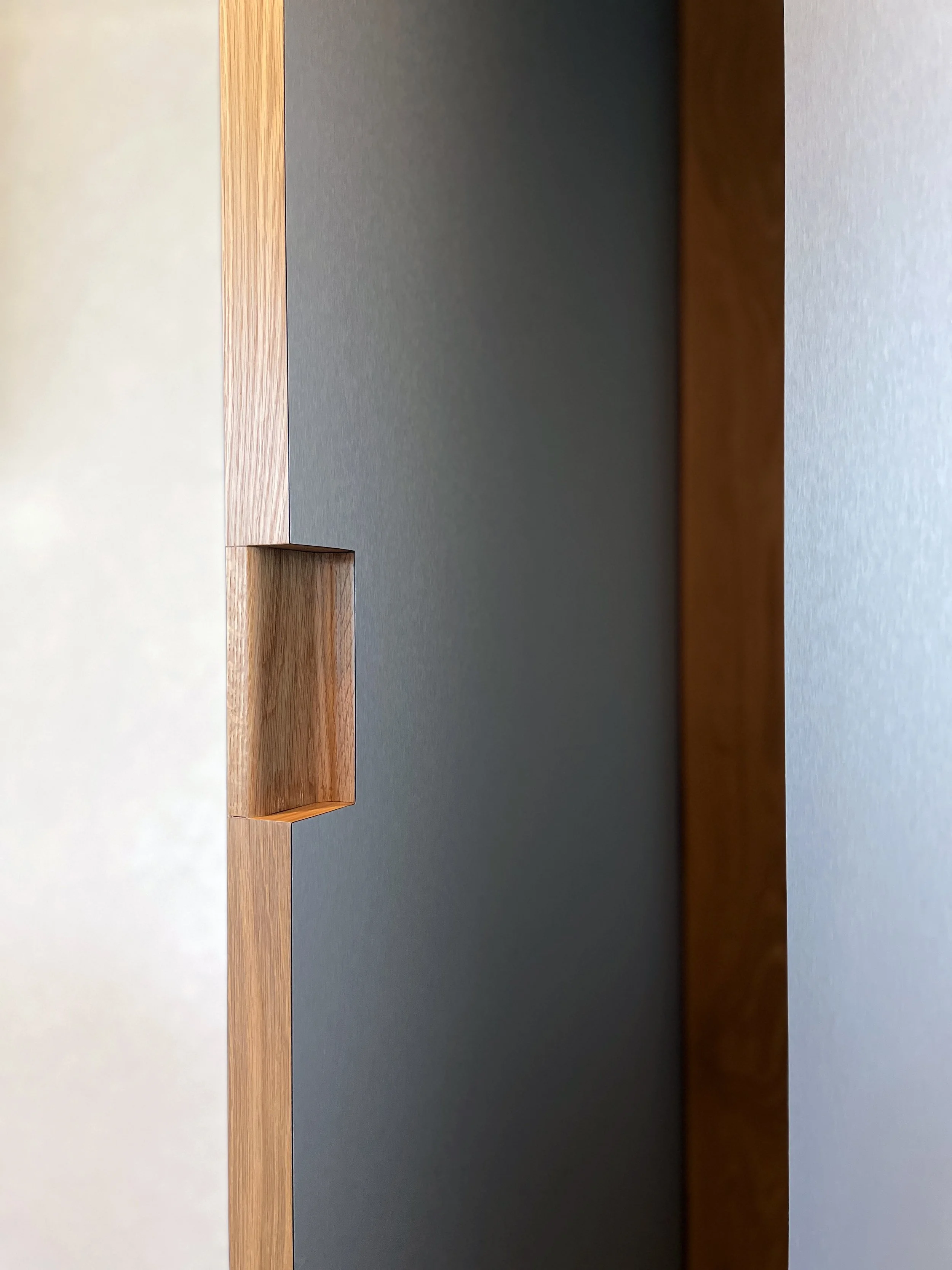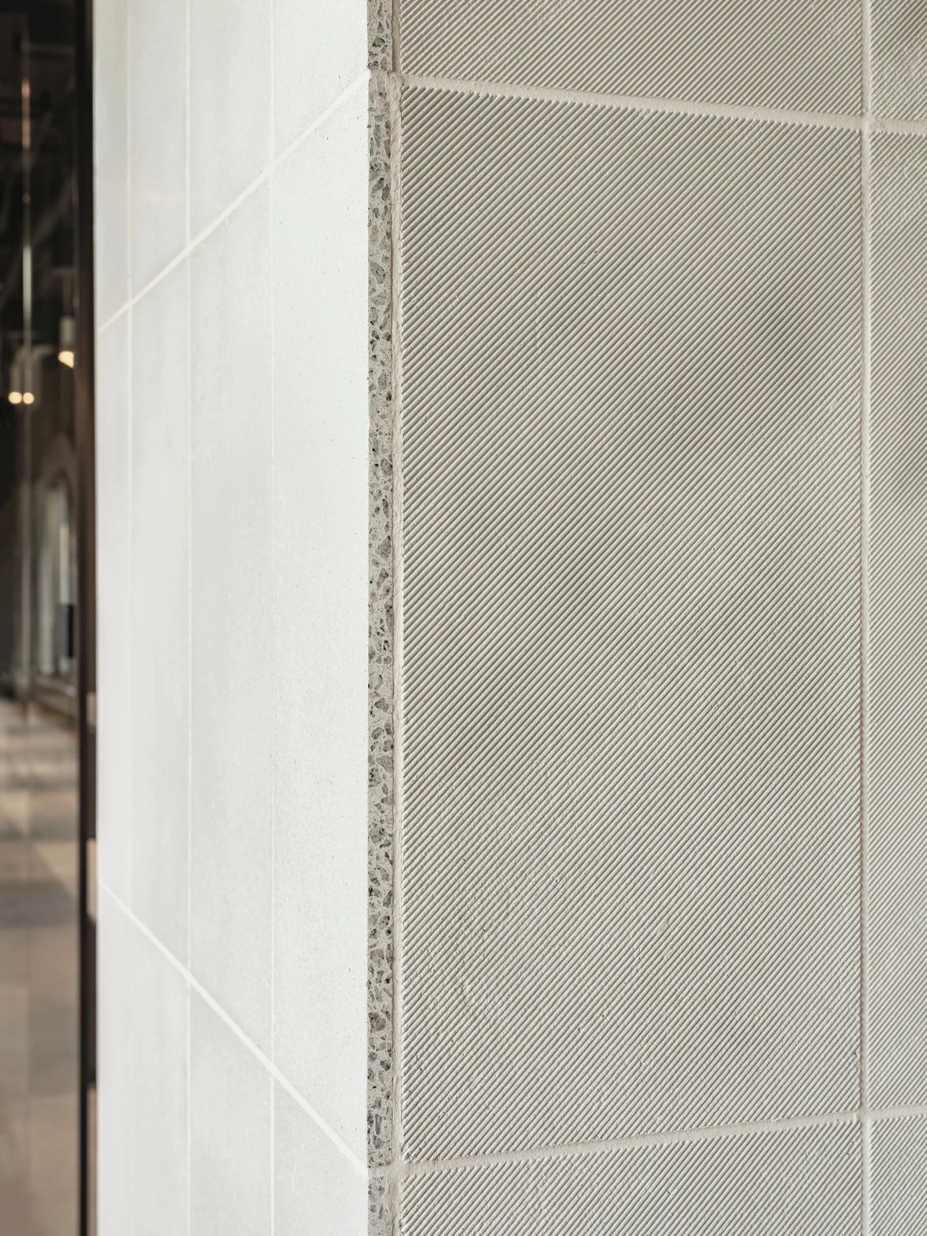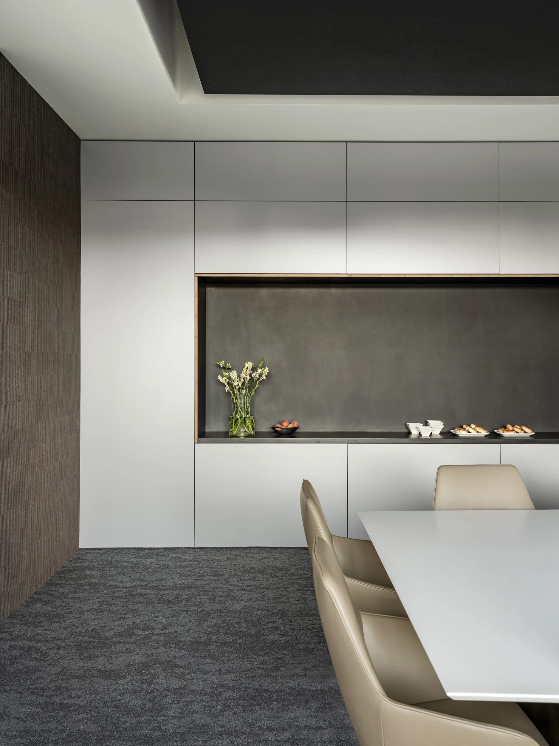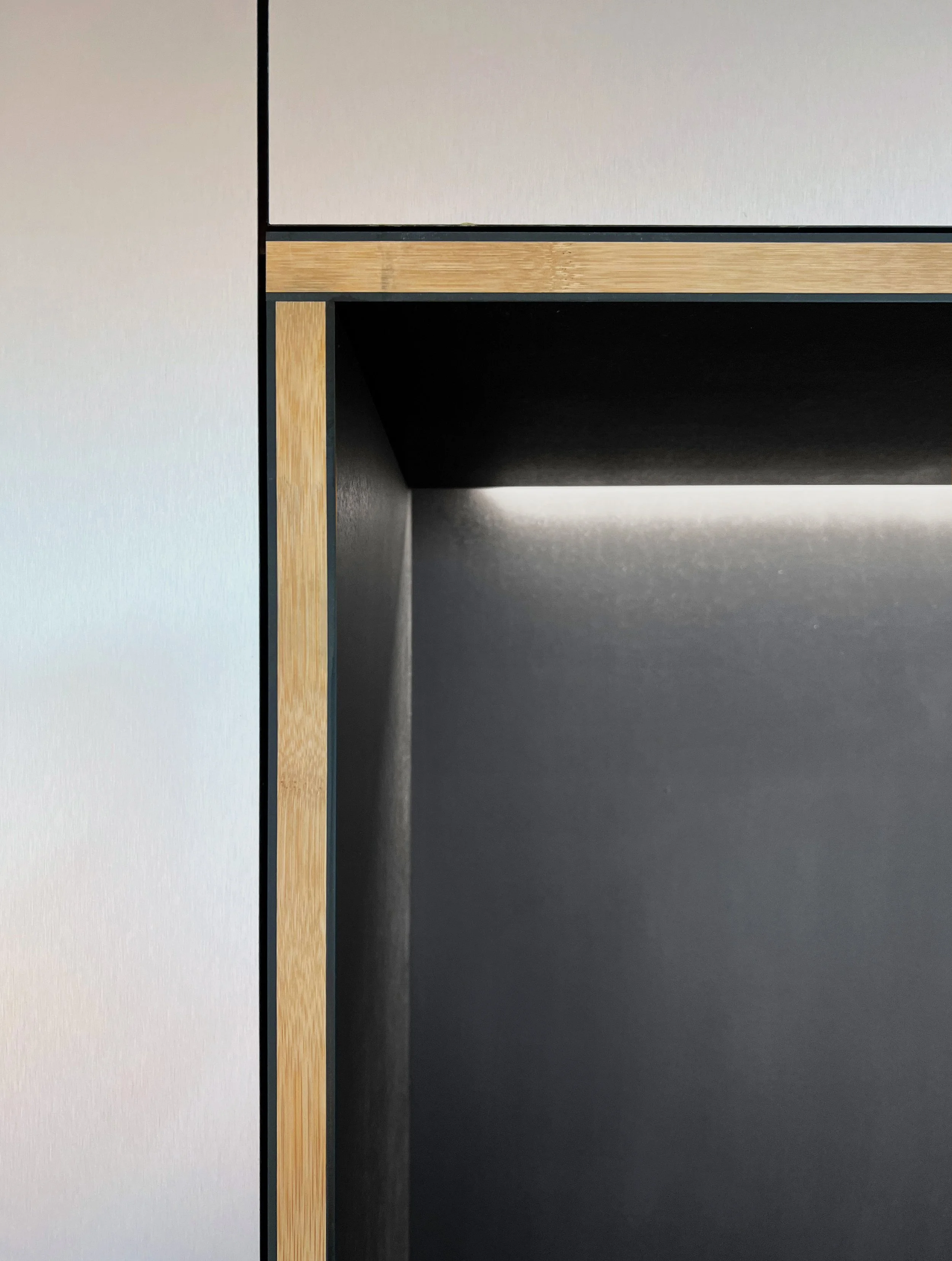 Throughout the three program zones we crafted a cohesive palette of subtle but rich and highly tactile materials. The exhibits are eye-catching and dynamic, and so the architectural materials provide a calm backdrop that draws you in for a second glance and a gentle touch. They are both timeless in their simplicity but also an embodiment of a sustainable future. They include back-lit panels made of fused recycled glass, acoustic ceiling baffles made from recycled PET bottles, felt walls made from un-dyed sheep’s wool, wall panels and hidden doors clad in super-matte metallic nanocomposites, door and cabinet surrounds made from recycled paper panels with sustainably harvested bamboo cores, and hand-made concrete tiles and terrazzo countertops in a subtle variety of textures. We are proud to say that the project achieved LEED Platinum certification.