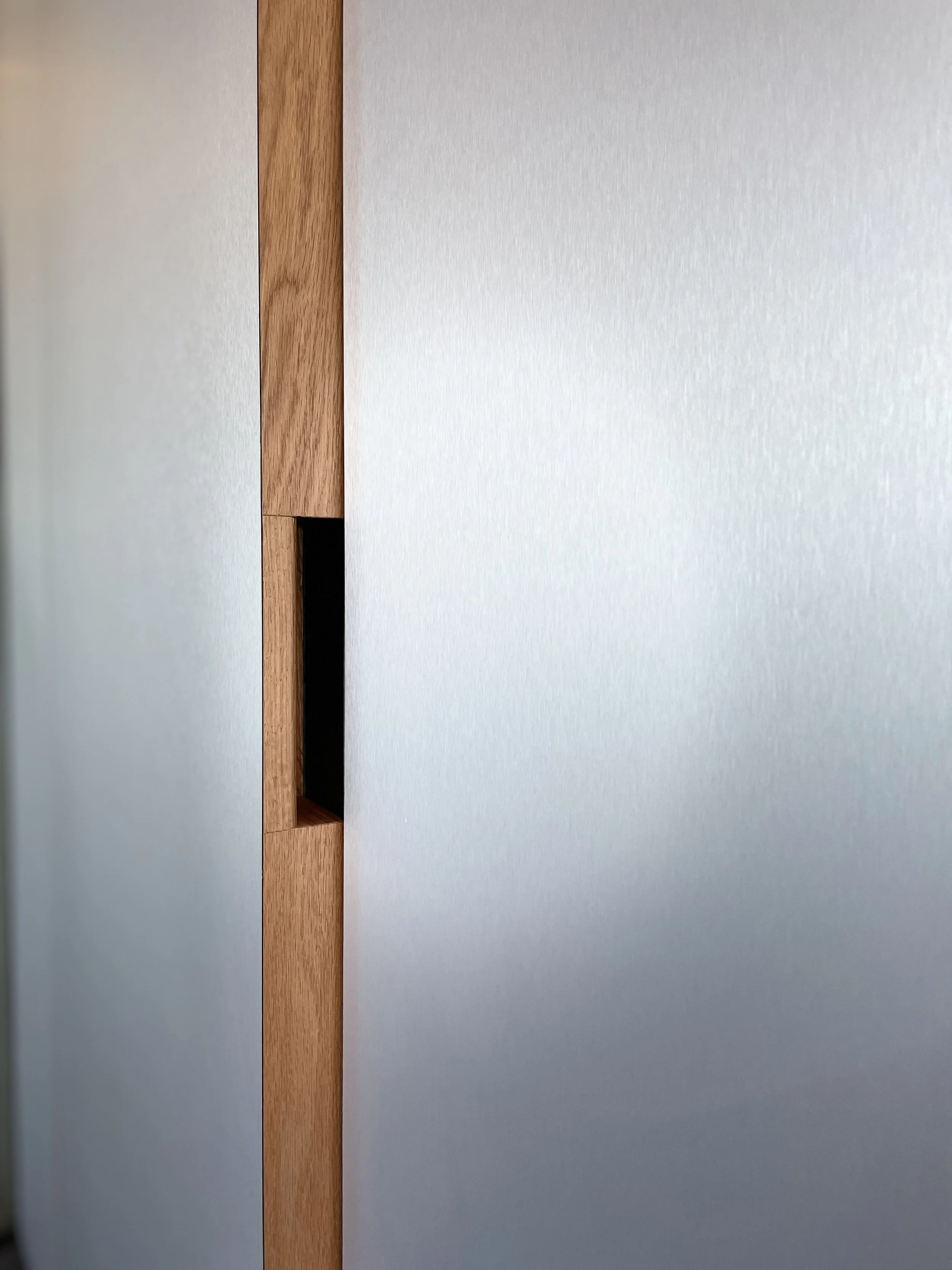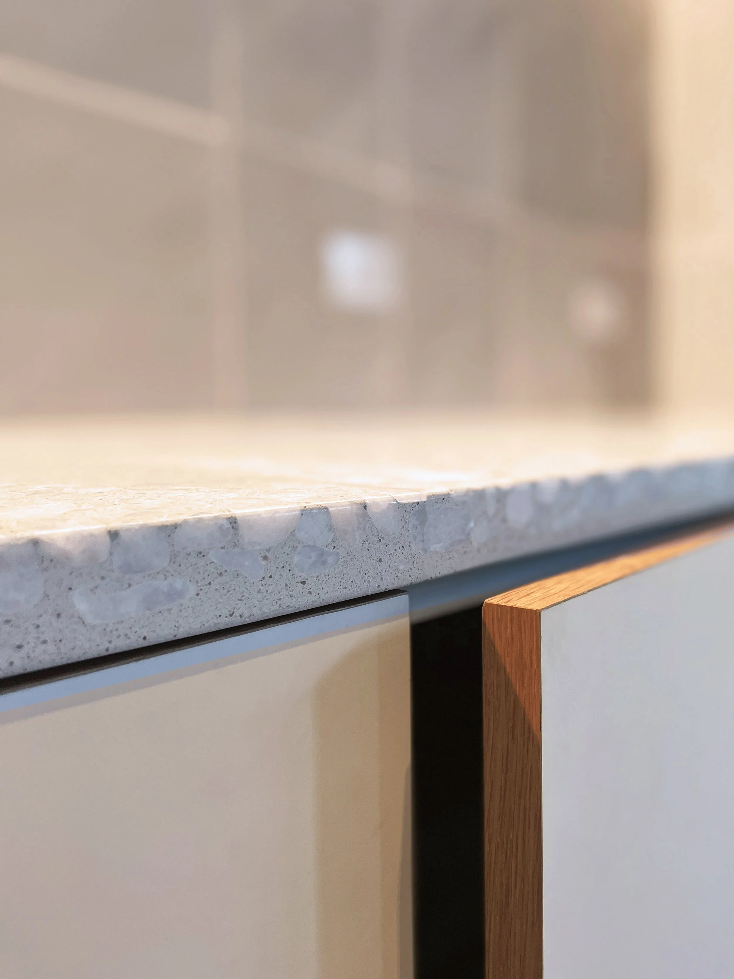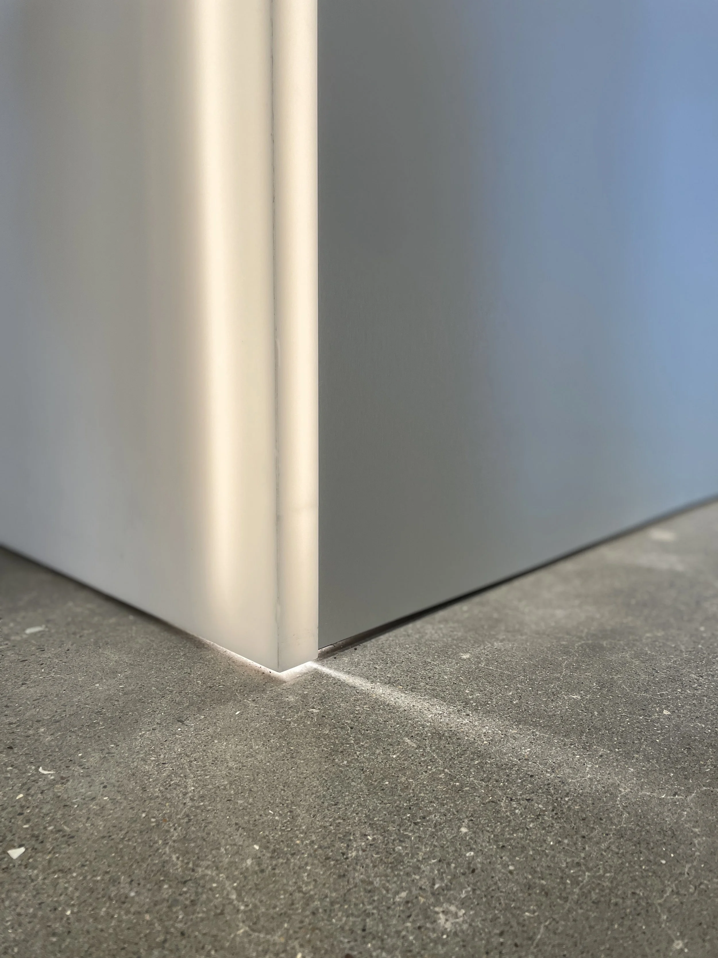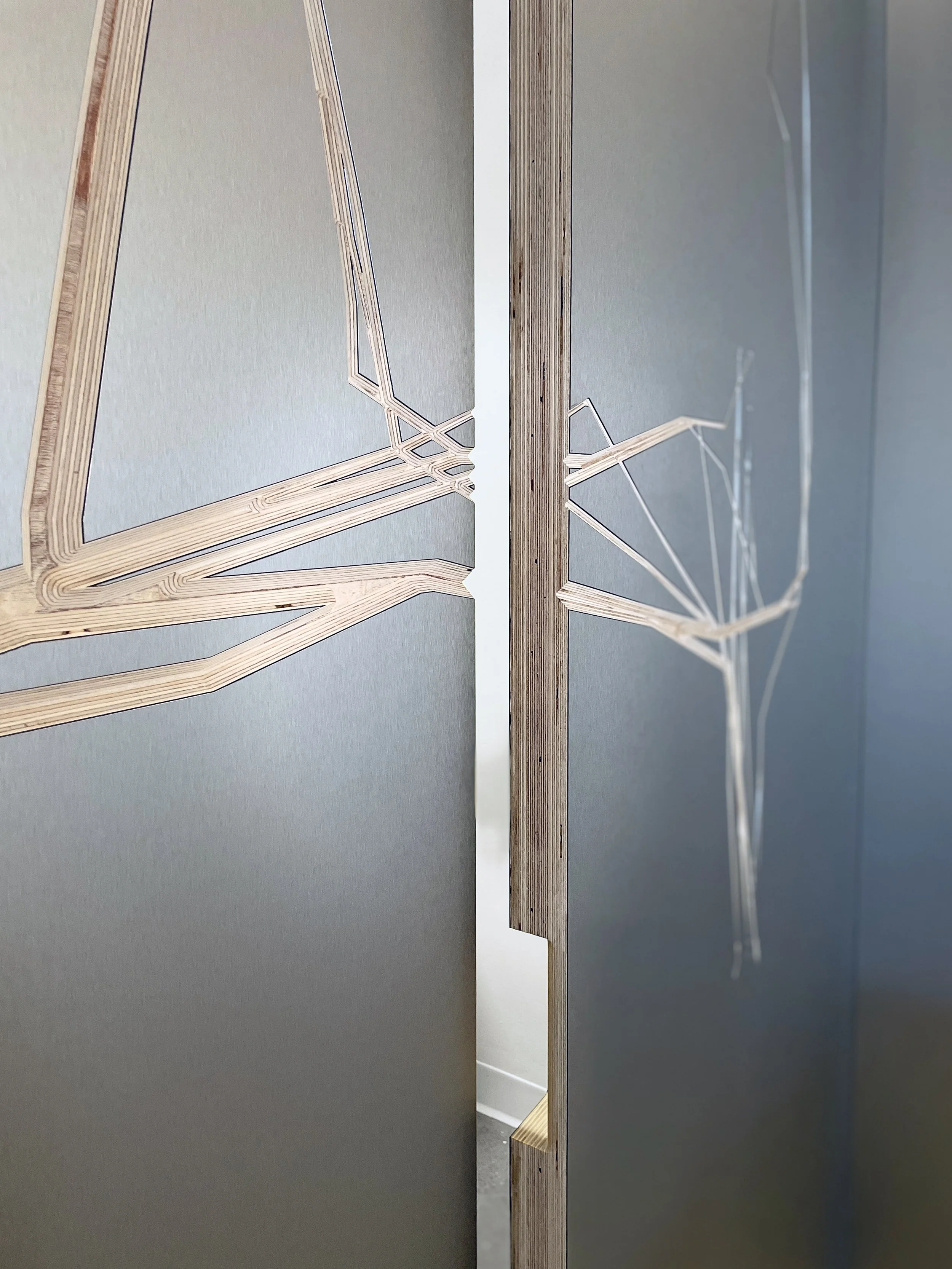 Throughout the three program zones we crafted a cohesive palette of subtle but rich and highly tactile materials. The exhibits are eye-catching and dynamic, and so the architectural materials provide a calm backdrop that draws you in for a second glance and a gentle touch. They are both timeless in their simplicity but also an embodiment of a sustainable future. They include back-lit panels made of fused recycled glass, acoustic ceiling baffles made from recycled PET bottles, felt walls made from un-dyed sheep’s wool, wall panels and hidden doors clad in super-matte metallic nanocomposites, door and cabinet surrounds made from recycled paper panels with sustainably harvested bamboo cores, and hand-made concrete tiles and terrazzo countertops in a subtle variety of textures. We are proud to say that the project achieved LEED Platinum certification.
