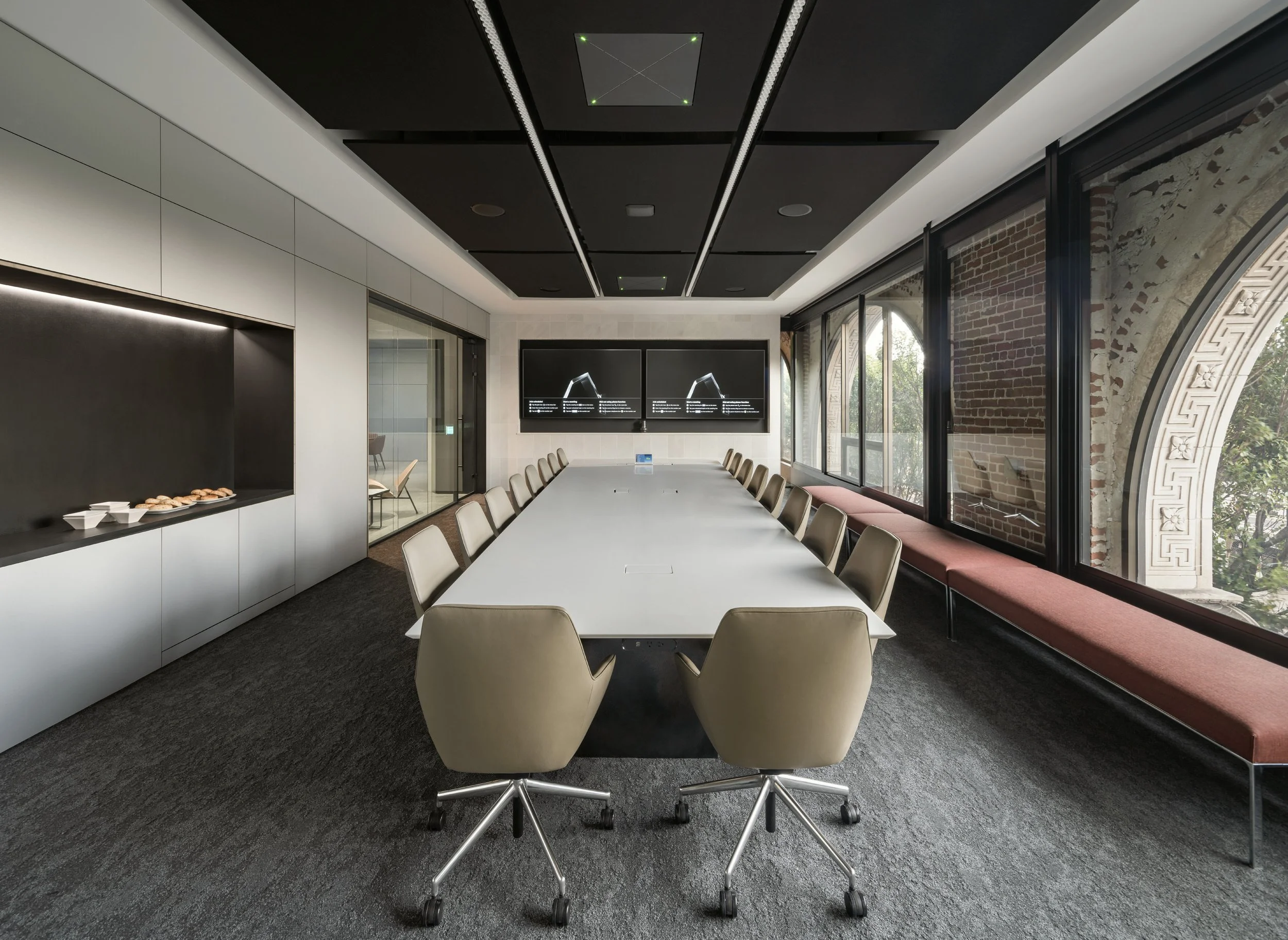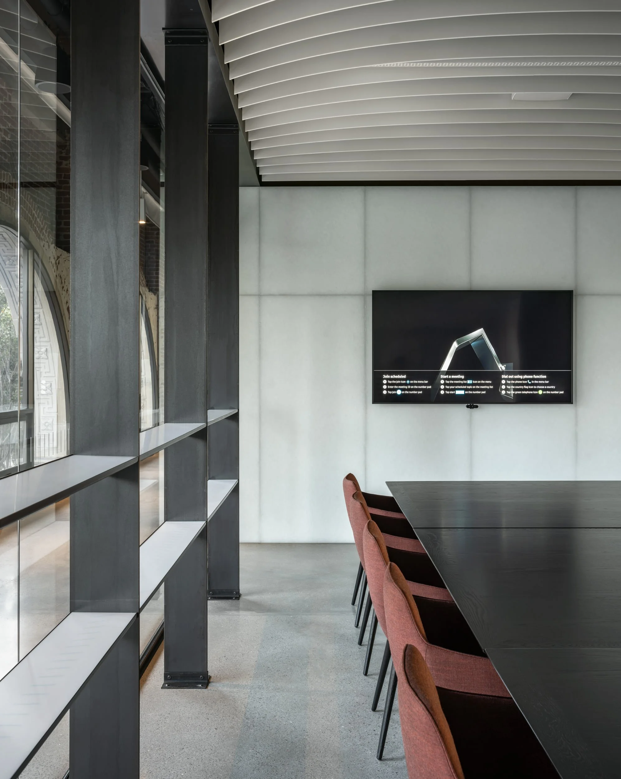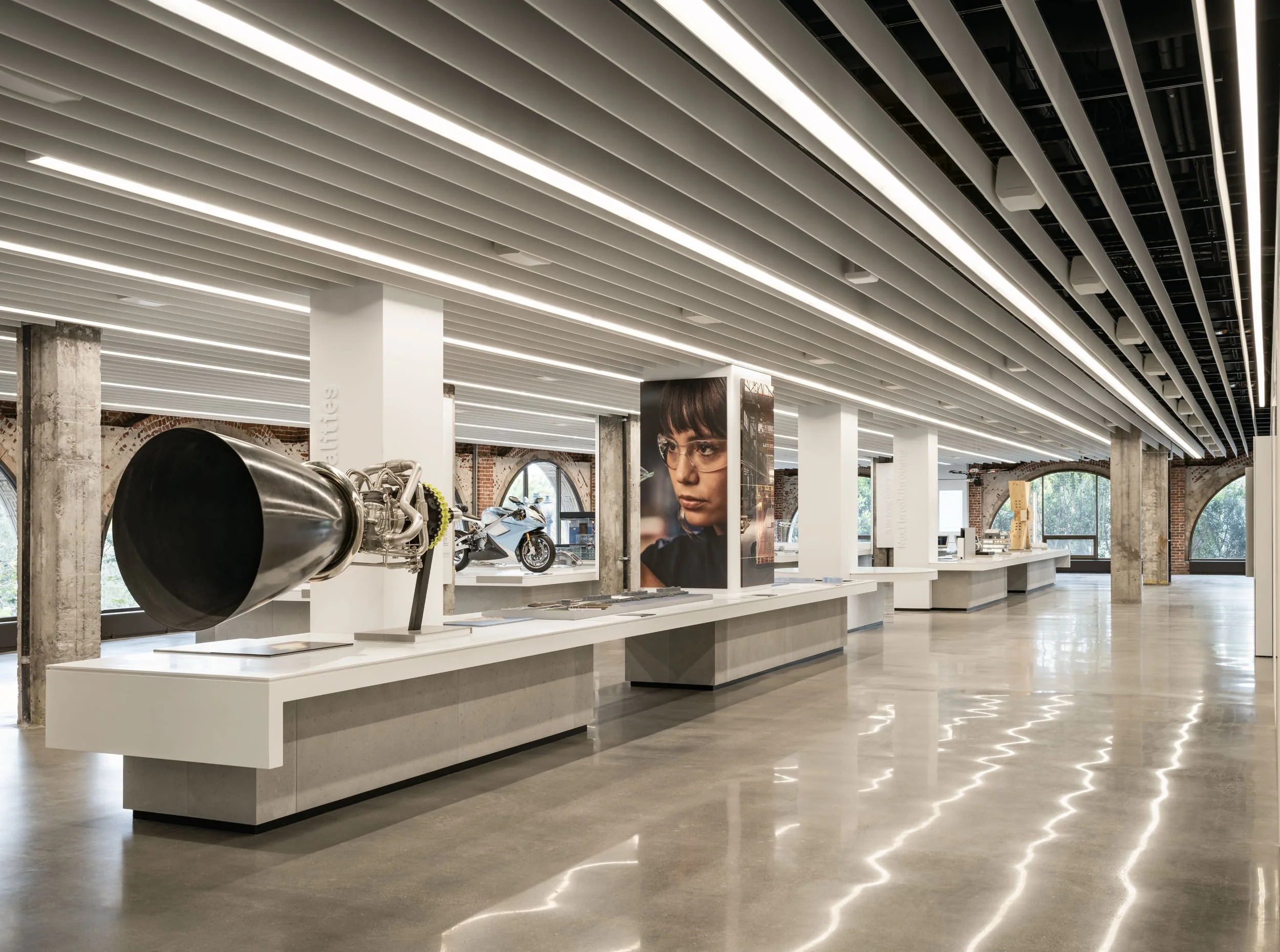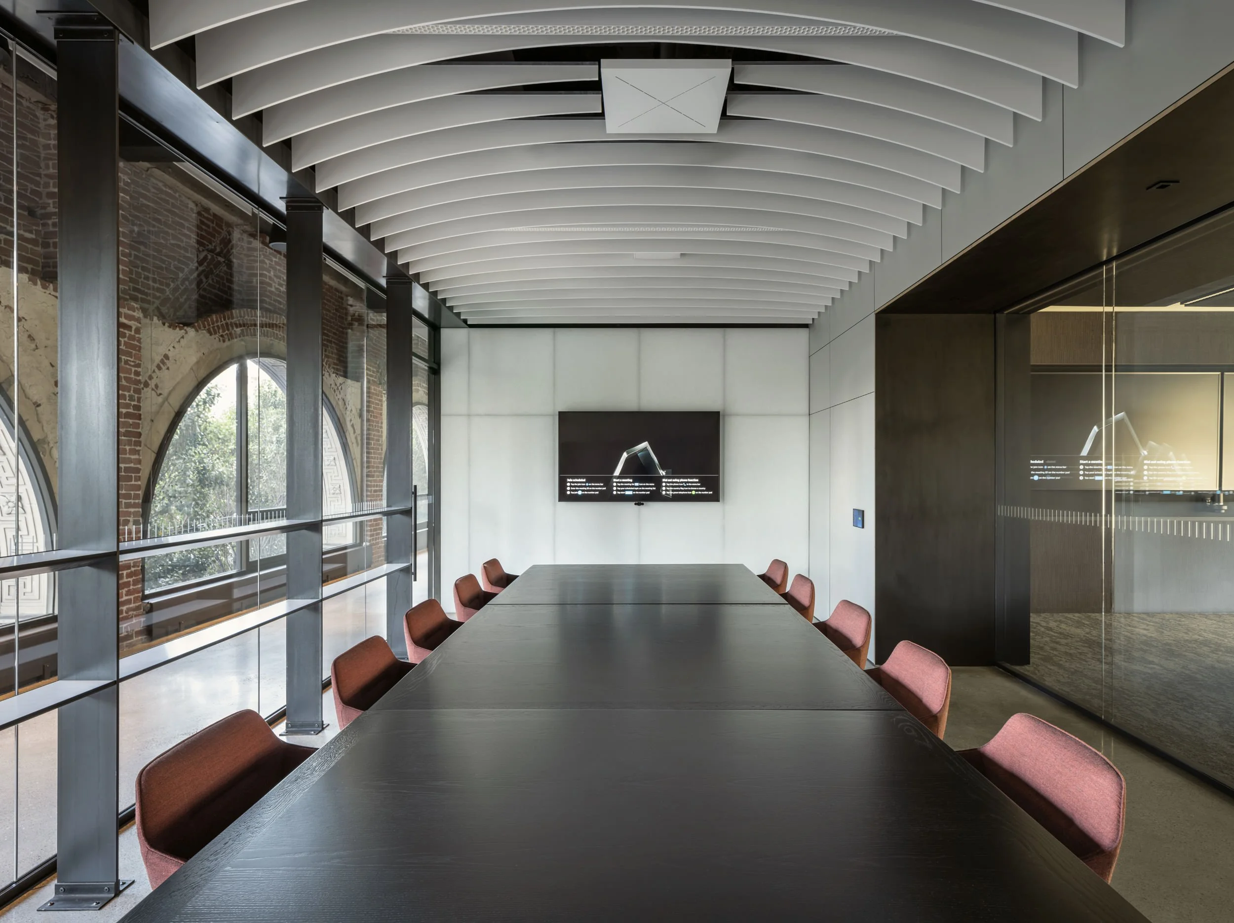 The initial design response was to pull everything back from the exterior brick walls and to celebrate the historic façade by contrasting it with a crisp, refined interior. This left an open space around the perimeter, across from which we created a thickened “ribbon wall” surrounding the building core and enclosing the support spaces and intimate programs like lounges, conference rooms and phone booths. This allows the liminal zone between the core and exterior walls to remain expansive, bright, and highly flexible exhibit and event areas. This strategy also ties the three distinct programs together with a spatial approach that feels consistent despite the different program requirements.