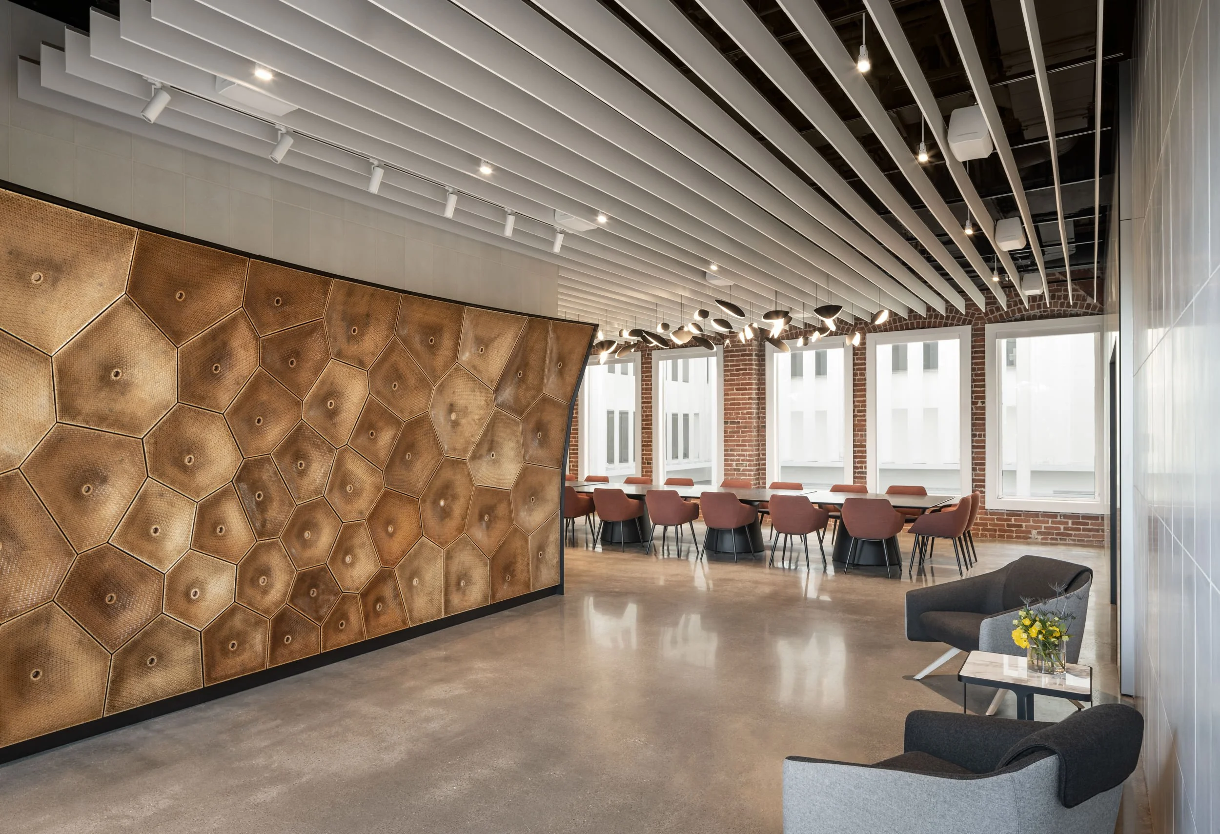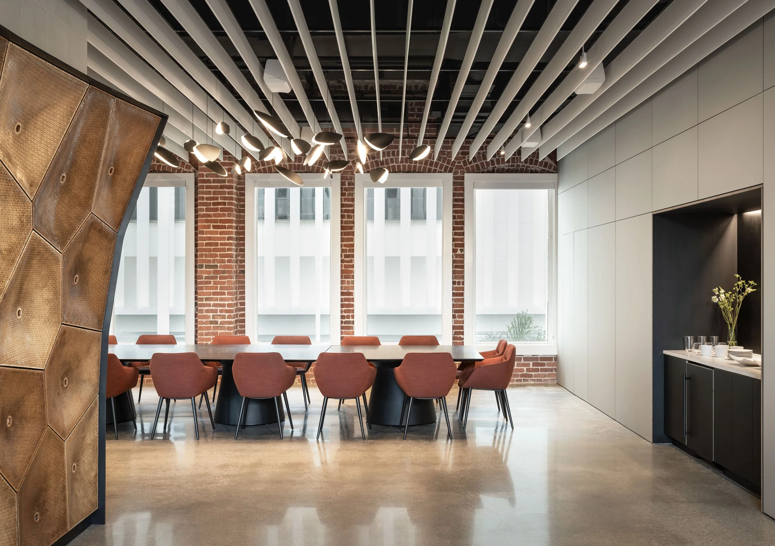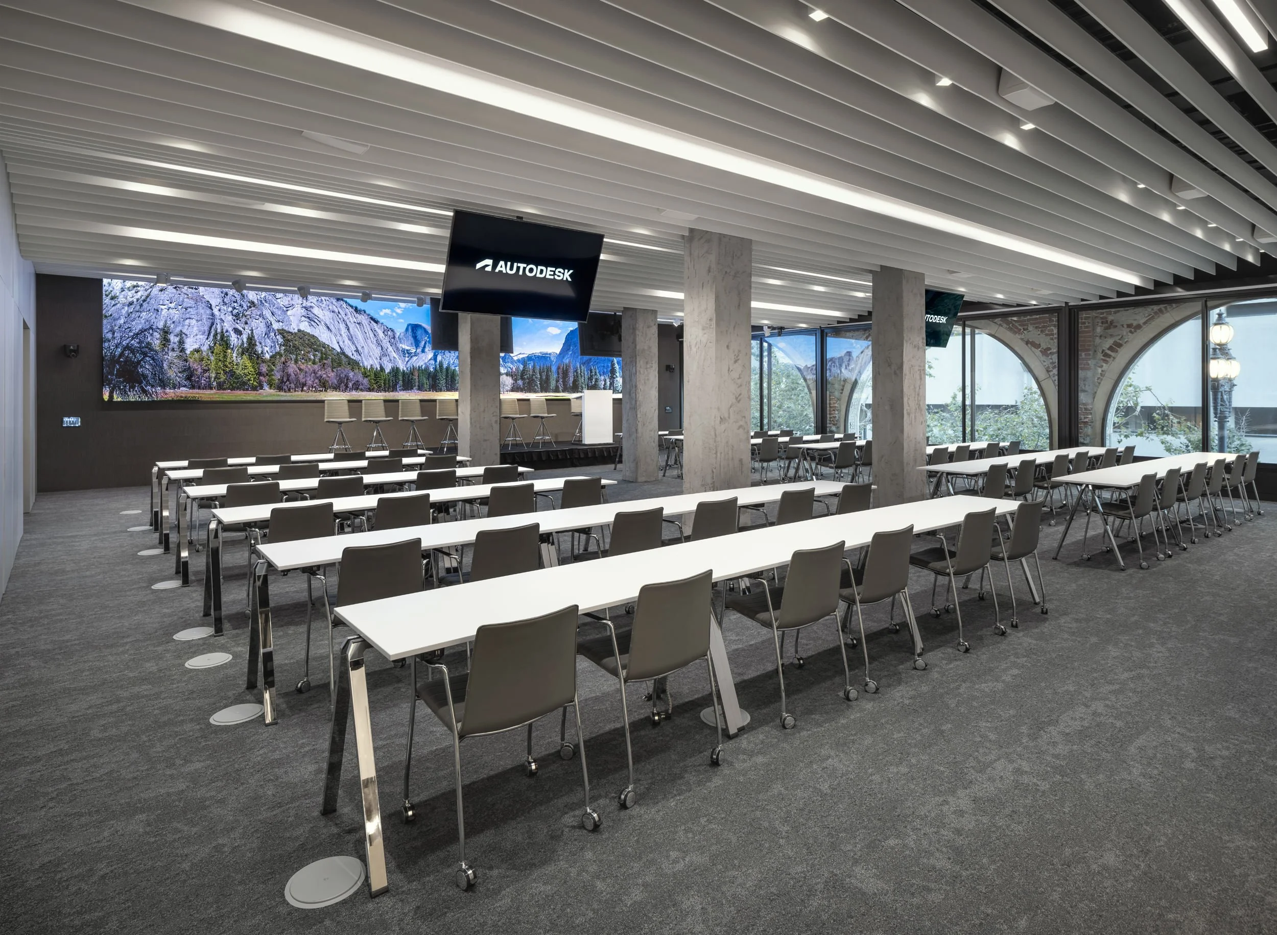 Since 2008, Autodesk’s Gallery at One Market St. in San Francisco showcased the outcomes of their client's applied research on the cutting edge of design innovation. Autodesk decided to redesign the space in concert with a shift in their branding efforts and an expansion of the program. The exhibition space would remain, but formerly ancillary functions would be transformed into a full executive briefing center with catering and dining capabilities, and a separate multipurpose event room for up to 300 guests.